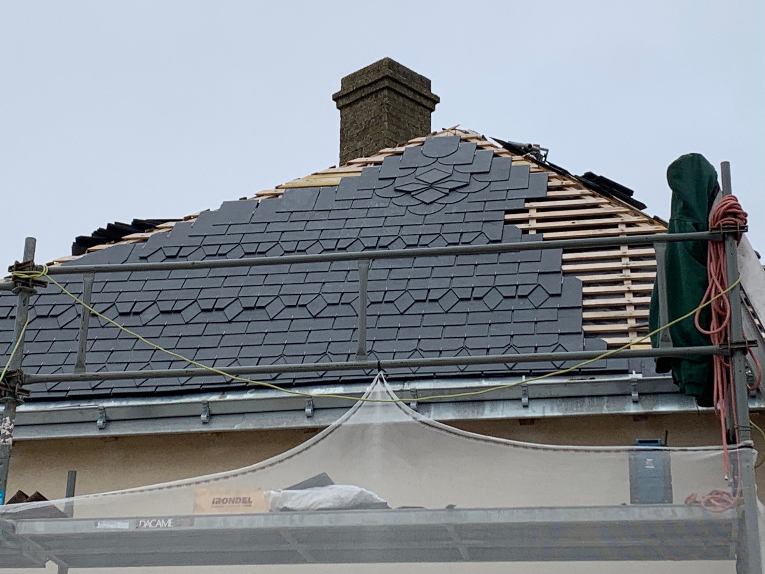Ce chantier portait sur la rénovation d’une toiture en ardoises, comprenant la dépose partielle de l’ancienne couverture et la reprise complète du pureau en ardoises naturelles. Après la préparation du support et la vérification de la charpente, nous avons procédé à la pose des liteaux et à la mise en œuvre des ardoises.